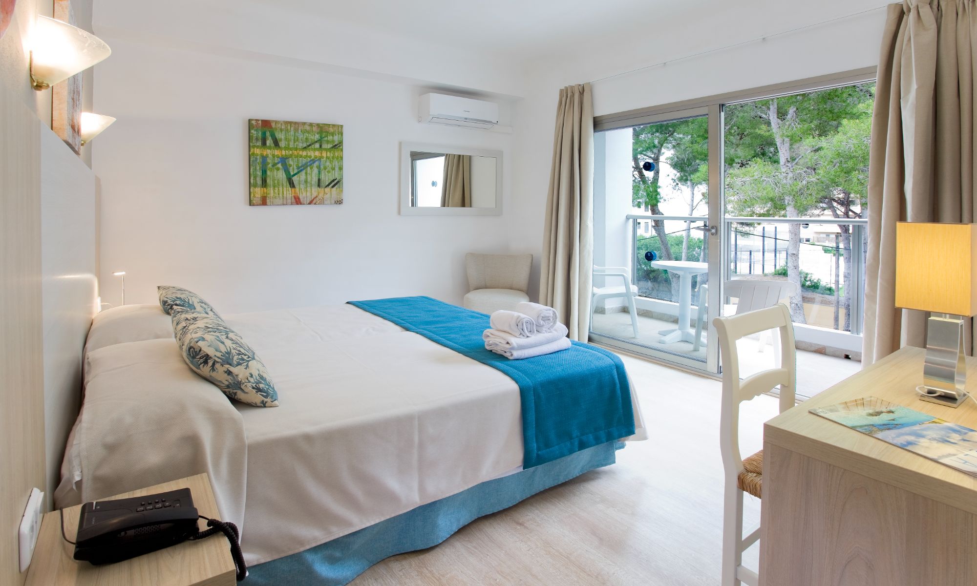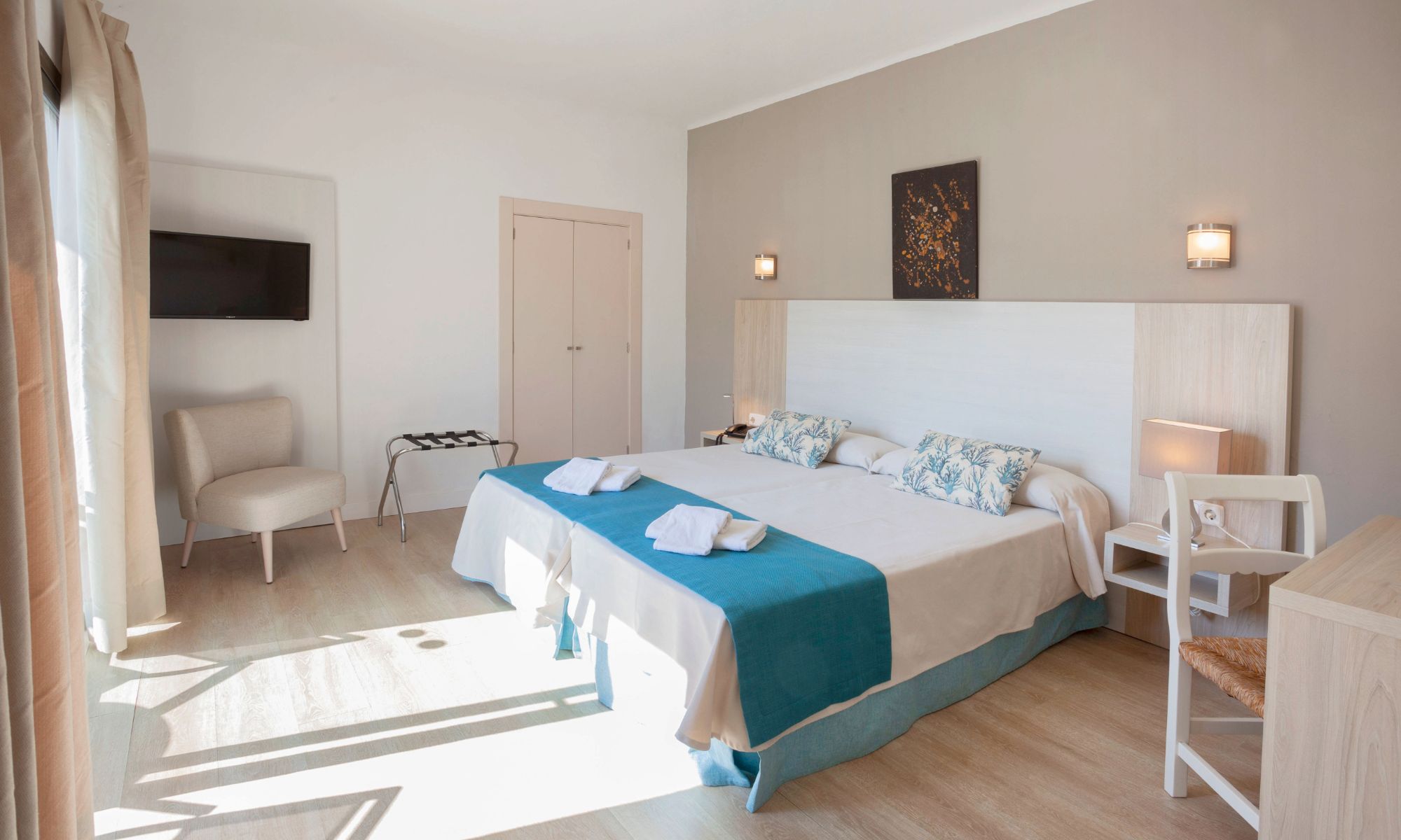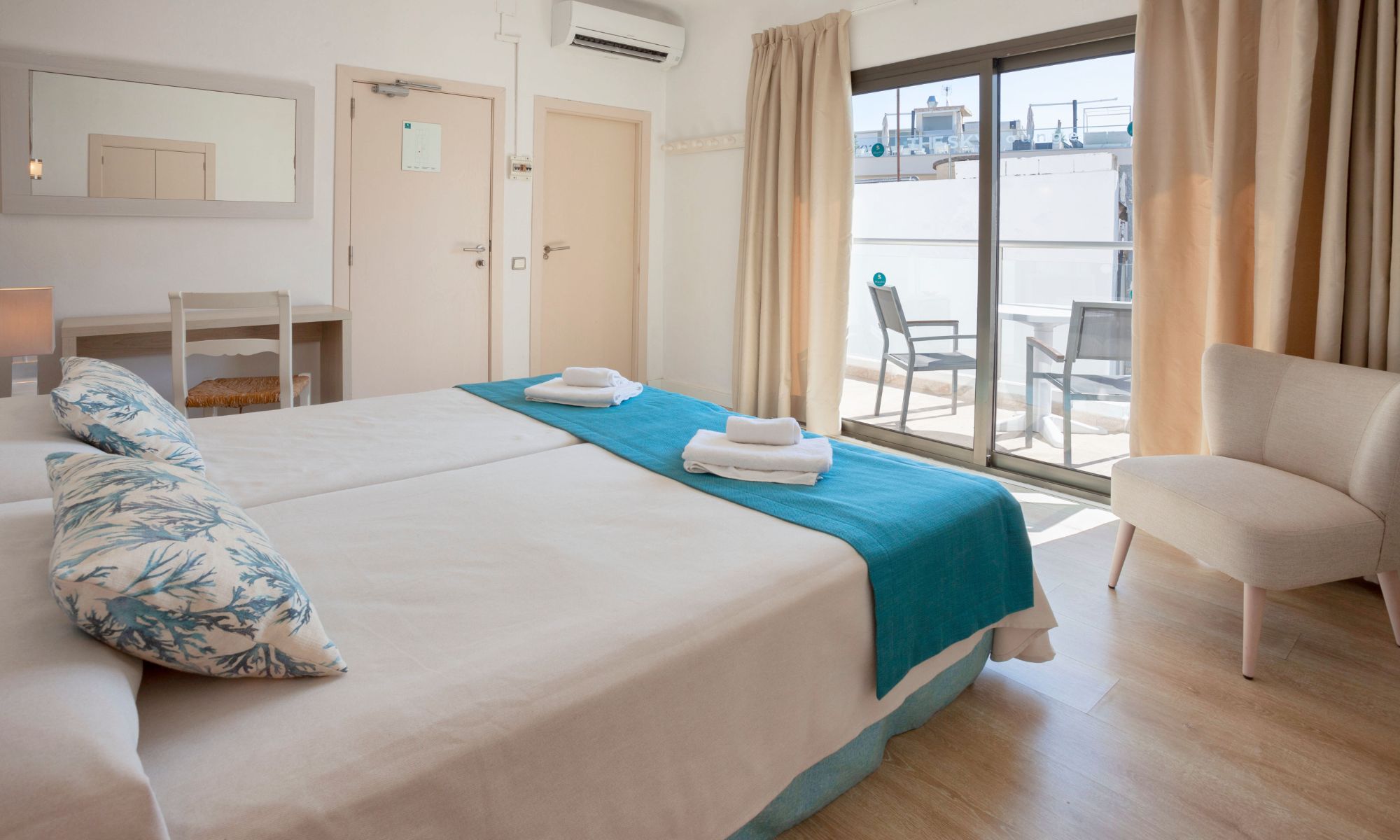 Con 20 m², posee dos camas individuales para que descanses con tranquilidad y comodidad. Incluye también baño privado con ducha y un balcón para que te dejes acariciar por la suave brisa de Mediterráneo cada mañana. Es un espacio sencillo y reconfortante que da sensación de calidez.